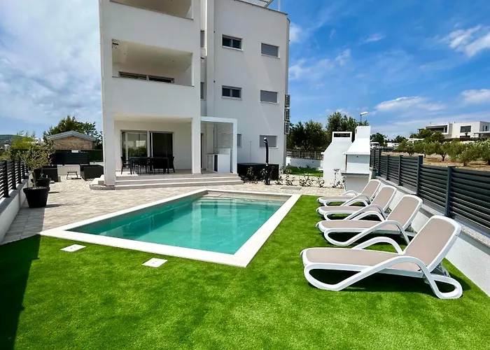 Wraz z udogodnieniami do samodzielnego przygotowywania posiłków, takimi jak wyposażonym aneksem kuchennym, apartament zapewnia gościom jadalnię. Przystanek autobusowy Autobusni kolodvor Vodice znajduje się w bliskiej odległości od tego apartamentu. Dzięki luksusowym udogodnieniom, w tym jacuzzi i basenowi ze słoną wodą, goście mogą odpocząć i zrelaksować się. Obecność jacuzzi w apartamencie Vila Vasilj Dein Eigener Pool Oder Dein Eigener Whirlpool Mit Aussicht, Dein Urlaub, Deine Privatsphaere, Deine Wahl również przyczynia się do przyjemniejszego pobytu.